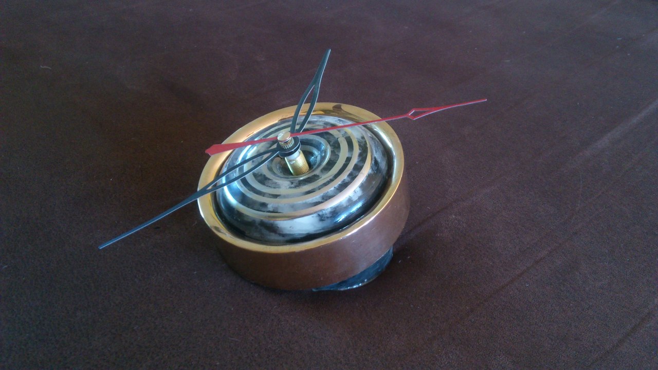 Een klok gemaakt uit ingelegde grijs/witte speksteen met een ring van messing eromheen en een Quatrz uurwerk.