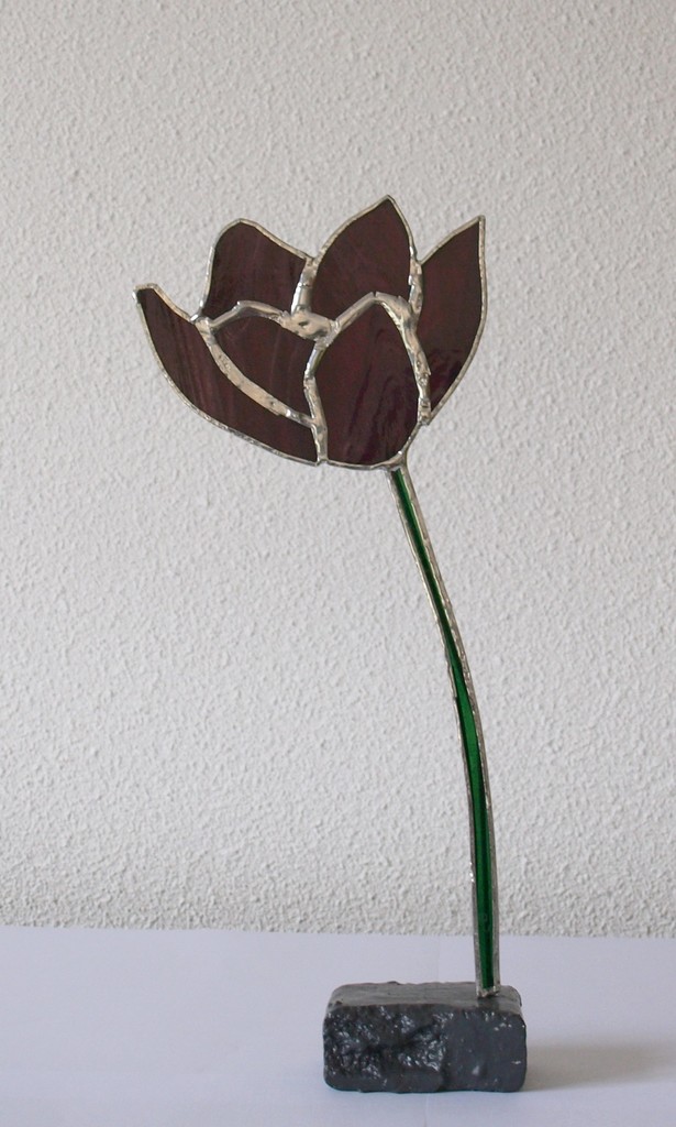 Glazen variant op de tulp. Opgebouwd uit translucent donkerpaars opaalglas (kop), en groen waterglas voor de steel. Op sokkeltje.