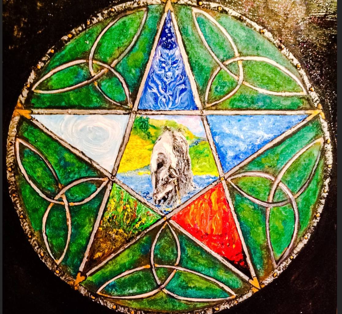 Schild met de vijf elementen. Verwerkt in Keltische motieven. Met de eenhoorn in het centrum. Hij doopt zijn hoorn in het water; een symbool voor ontgiften.