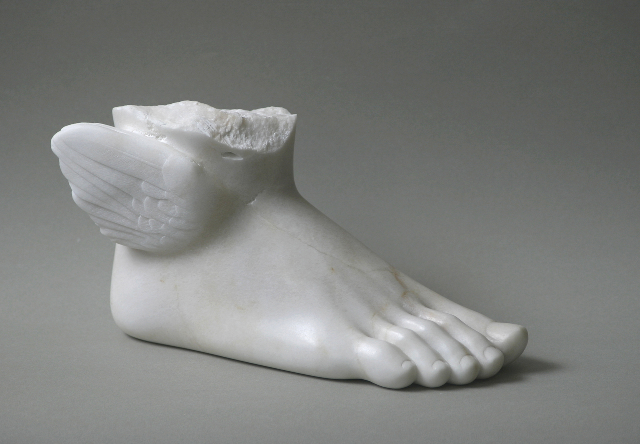 Gevleugelde Hermes- of Mercuriusvoet in wit albast.