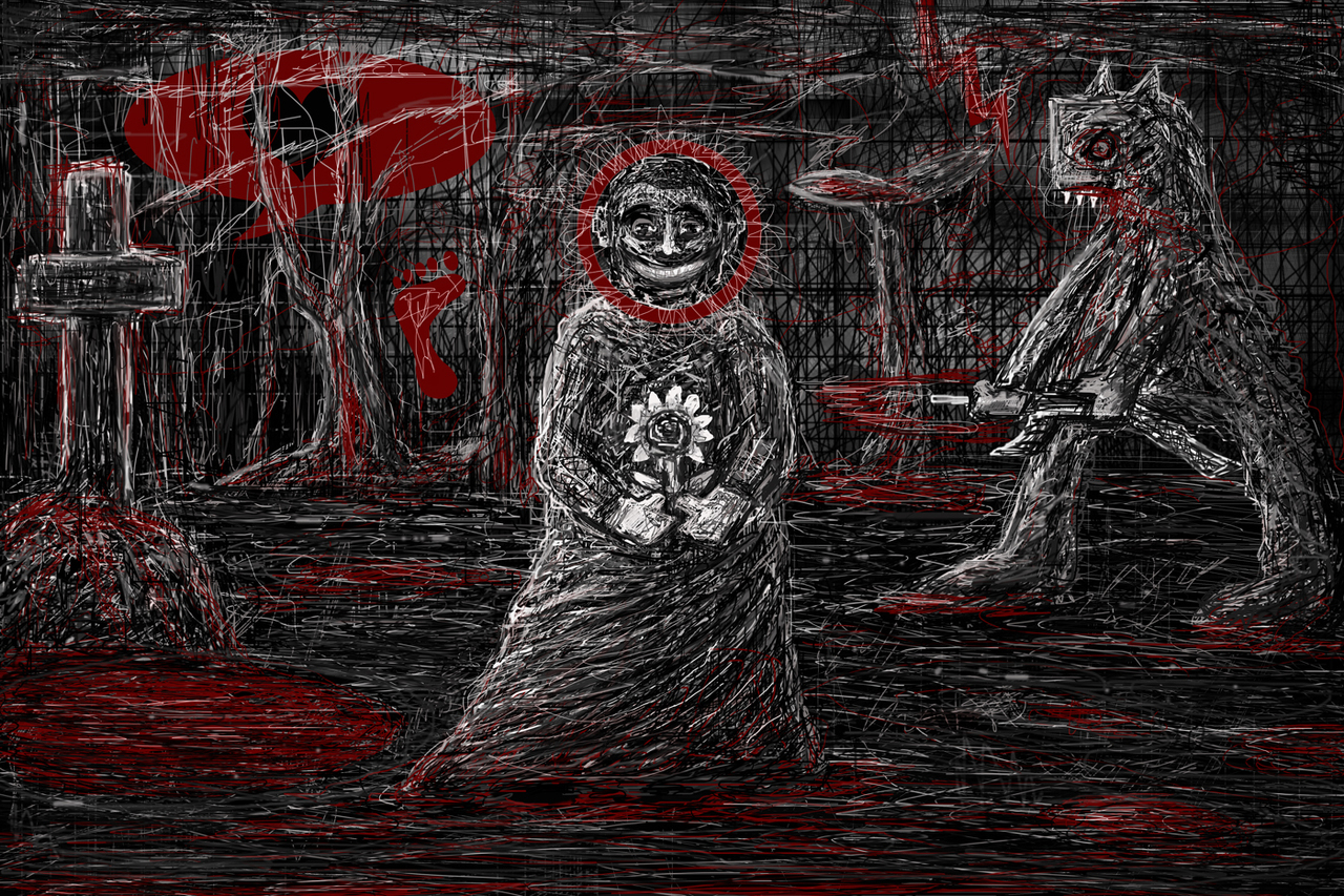 Wit Figuratief Rood Zwart Bloed Tekening Mens Hoop Oorlog Dood Angst Wereld Terreur Duivel Vrede Verandering Beest Sterk Terrorisme Verderf Digitalekunst Onbuigzaam Vergelding Digitaletekening