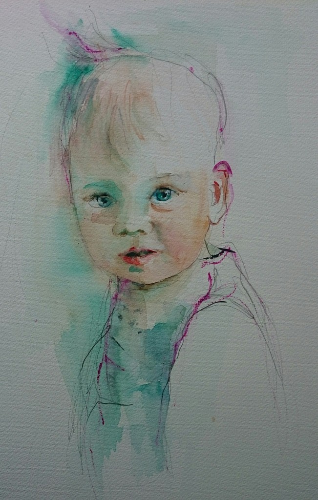 Een kinderportretje in aquarel. In opdracht aquarel op papier in lijst 50-50 350,-