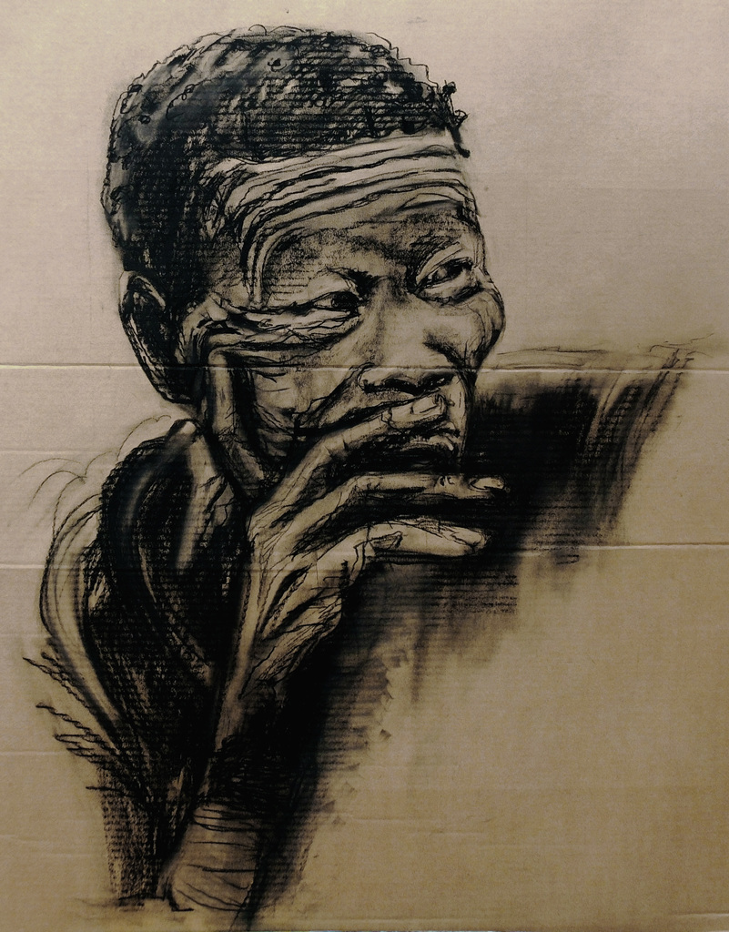 Contekrijt op bruin golfkarton. Het tweede werk van een serie portretten van nomaden.