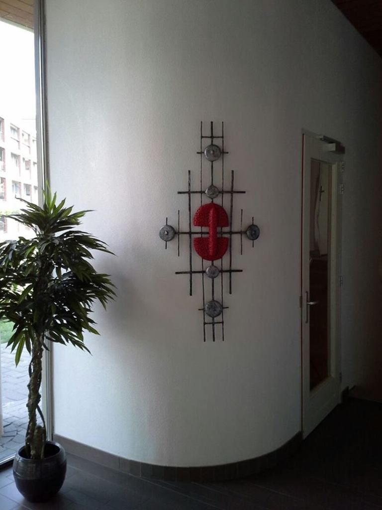 In opdracht gemaakt. Dit wandsculptuur hangt aan een ronde muur in een centrale hal van het Hofgebouw aan de Hoef in Rosmalen. Gemaakt van kunsthars.
