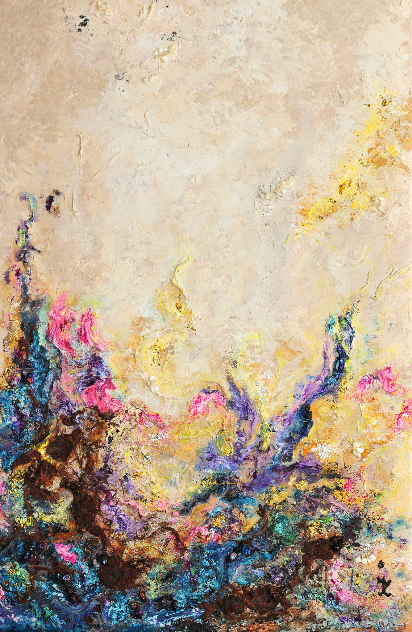 Acryl op doek, gemengde techniek met peacock pyriet, zirkoon, amethist, parelmoer.