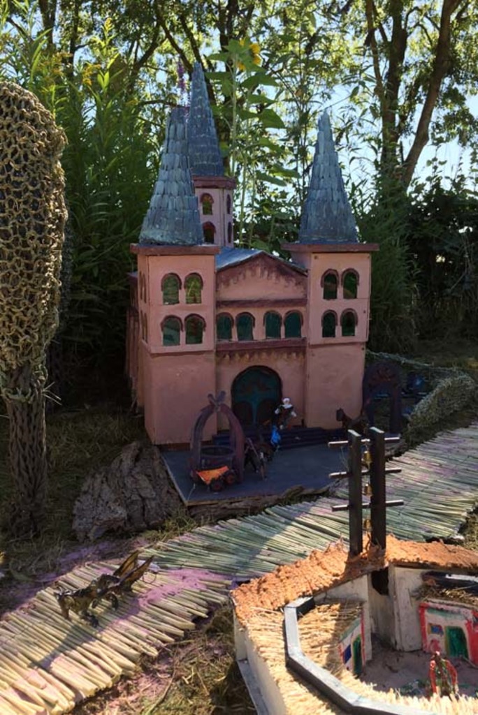 Met verschillende materialen heb ik een impressie gegeven van het 16e eeuwse dorp dat verdwenen is in 1570. Ik gebruik voornamelijk natuurlijke materialen als gras, boomschors en in dit geval ook hout voor de gebouwen.