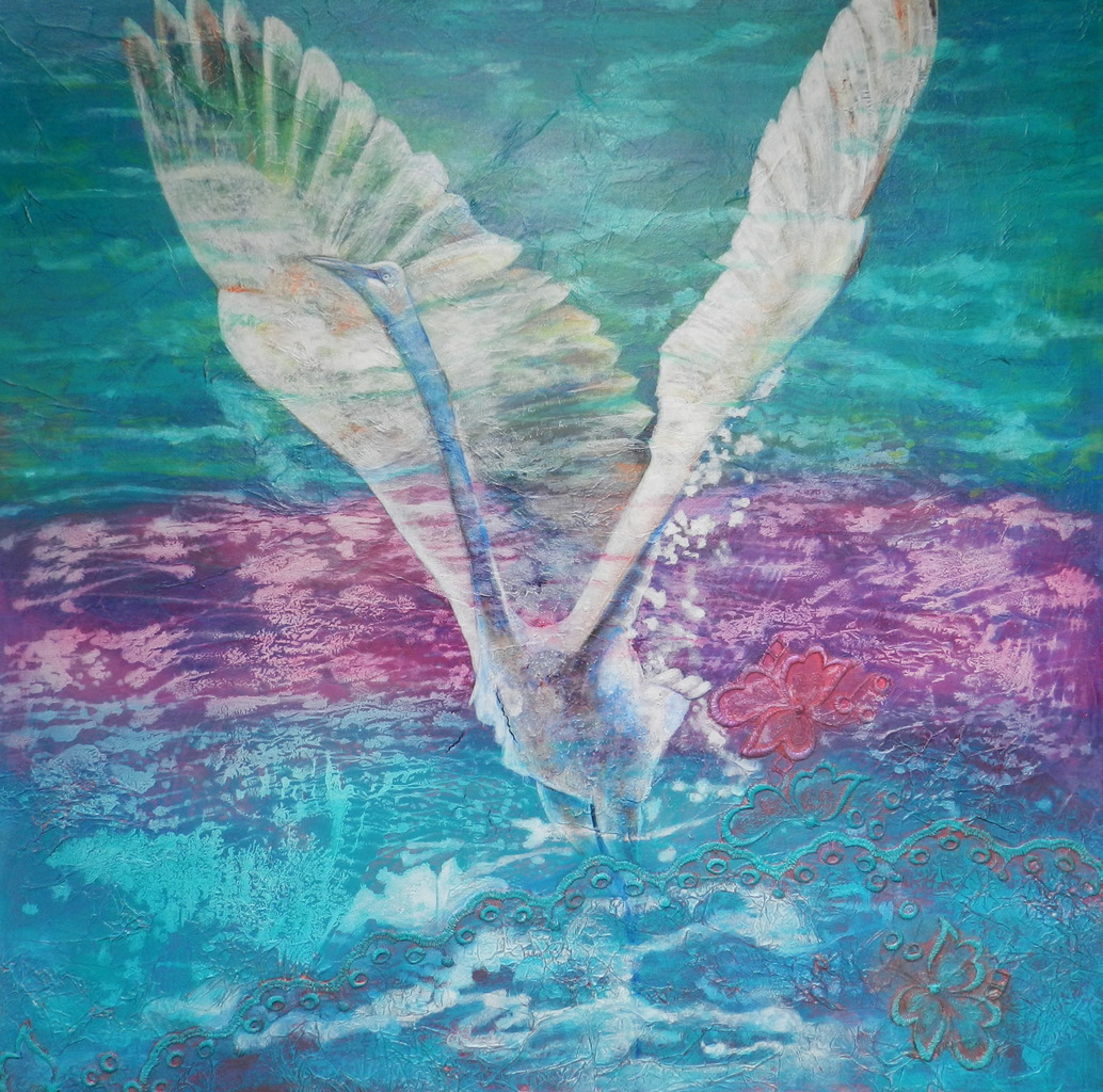 Met vleugels kon ik gaan waar ik wil. Zwaan uitgewerkt in acryl mixed media op canvas.