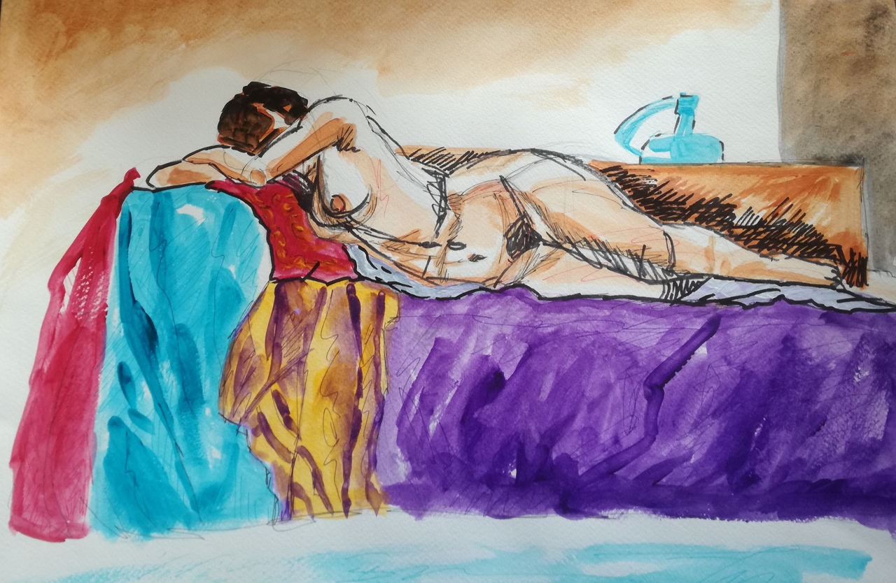 Ingekleurde schets/studie met acrylverf en inktpen.