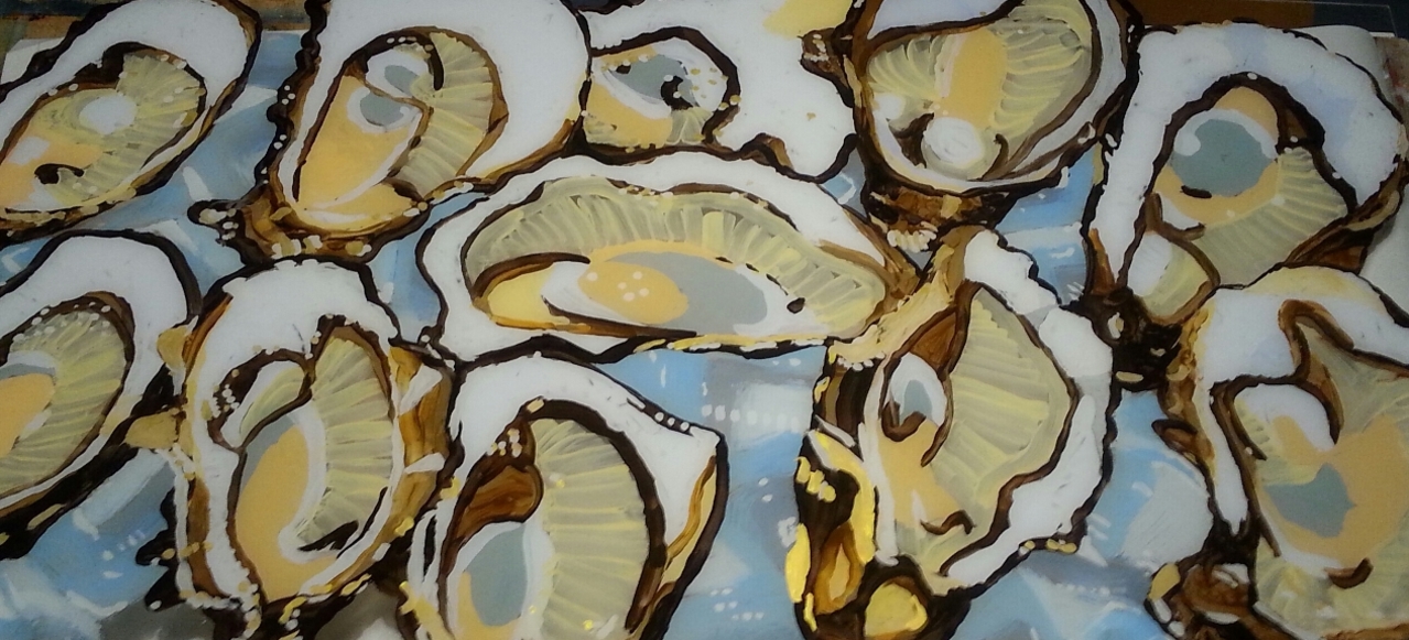 Schilderij voorstellend oesters op ijs. Acryl verf achter polycarbonate.