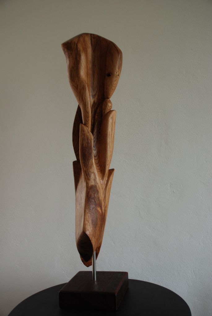 Het natuurlijke levendige van hout is voor mij de uitdaging. Het liefst werk ik "en taille directe". Zoeken in het hout. Hoe om te gaan met de kwasten? Hoe mee te gaan met de jaarringen? Opgenomen worden in die spelingen van de natuur. Dan een harmonieuze intrigerende sculptuur te maken. Met alles wat er door de natuur al in gebakken was.