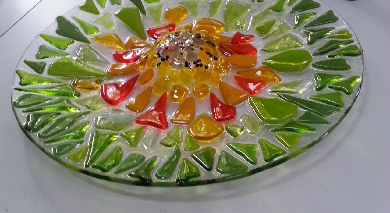 Grote ronde glazen schaal met bloemmotief, Bullseyeglass tackfusion met koper.