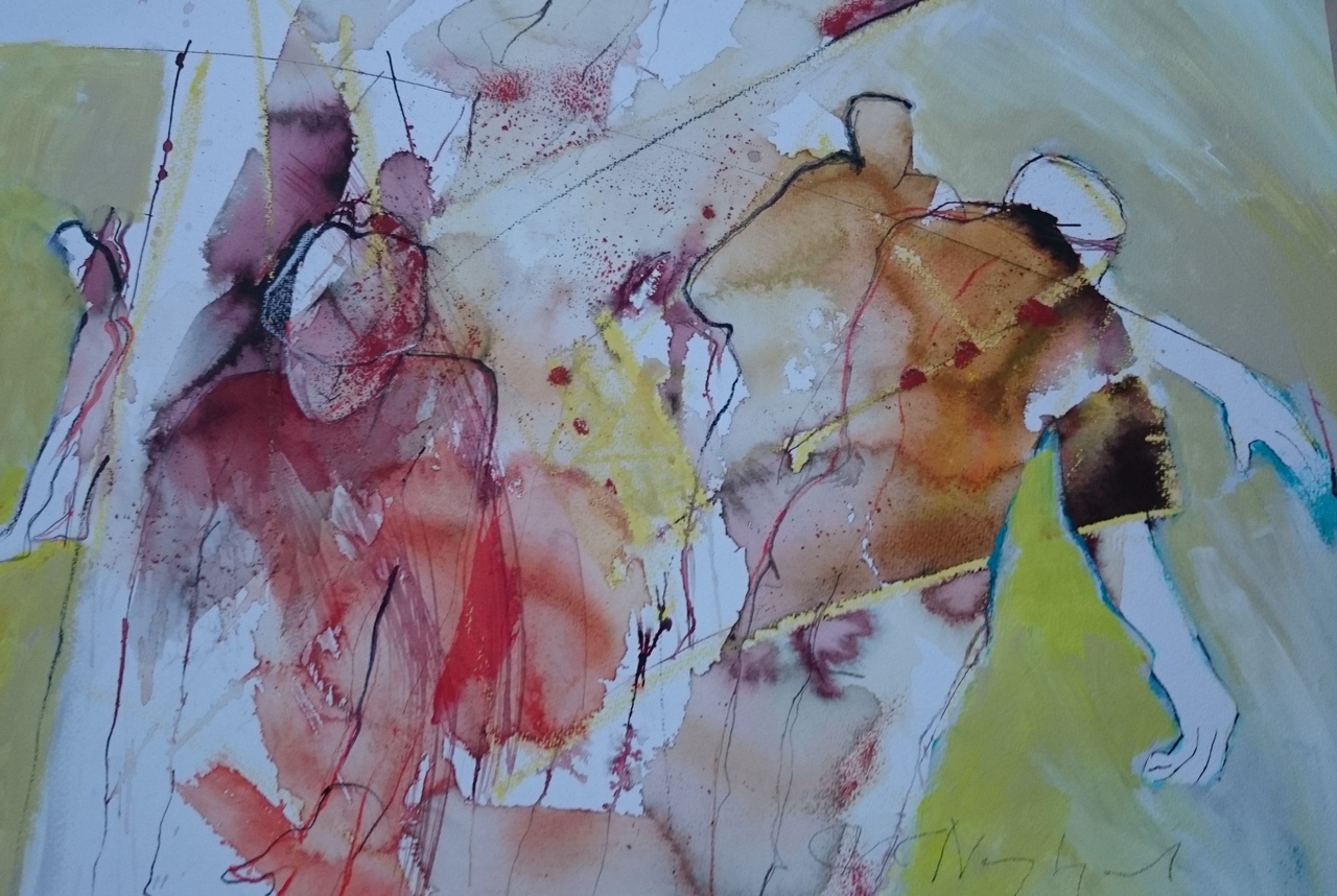 Een aquarel met gemengde techniek in warme kleuren over menselijk contact en de warmte die je daarvan als medemens kan ervaren.Naast aquarel heb ik ook wat oostindische inkt en acryl gebruikt.