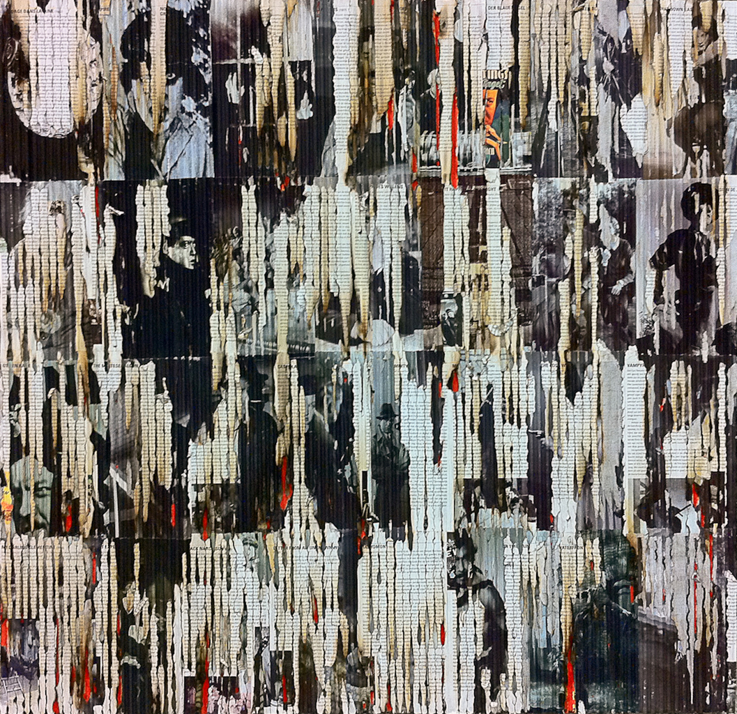 Culture Burning #1 Werk is in stock bij galerie Studio WW in Shanghai - China collage: zwart / wit films (zwart / wit denken) golfkarton op mdf, filmstills, filmbeschrijvingen (afgebrand) 80x80x2 2010
