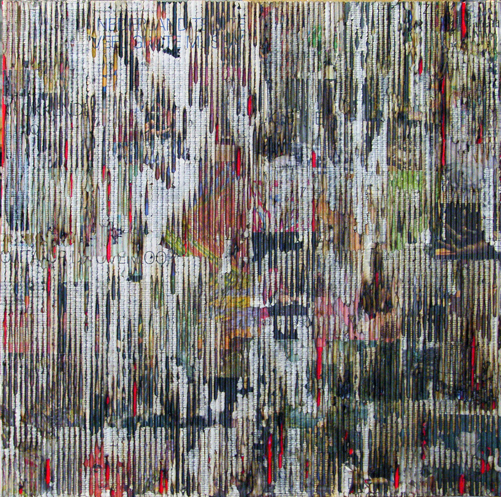 Culture Burning #2: Werk is in stock bij galerie Studio WW in Shanghai - China collage beeldende kunst golfkarton op mdf, persfotos kunst en persrecencies (afgebrand) 80x80x2 2010