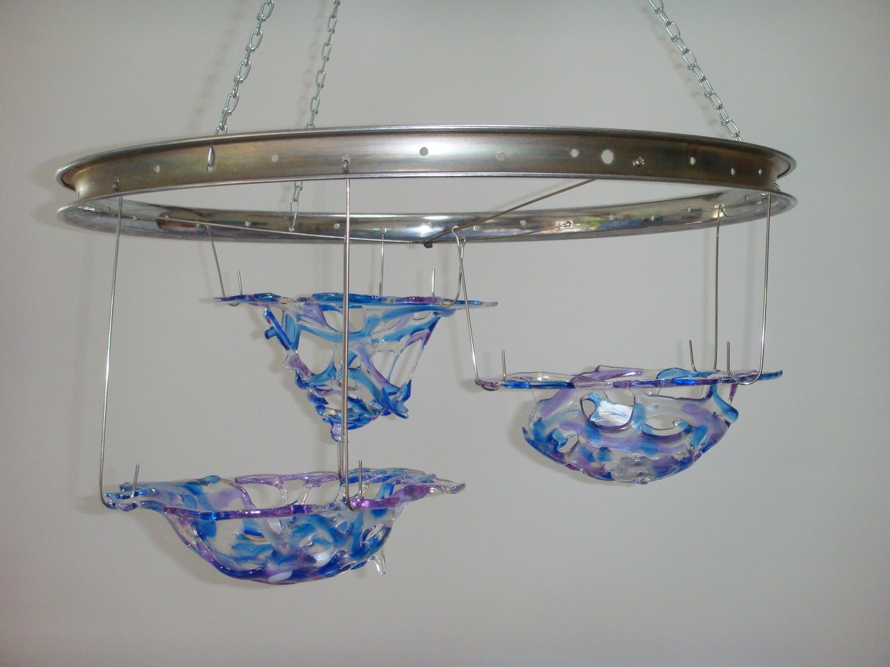 Drie ronde schalen van lichtblauw en paars Bullseyeglass en openingen hangend in metalen ring aan ketting.