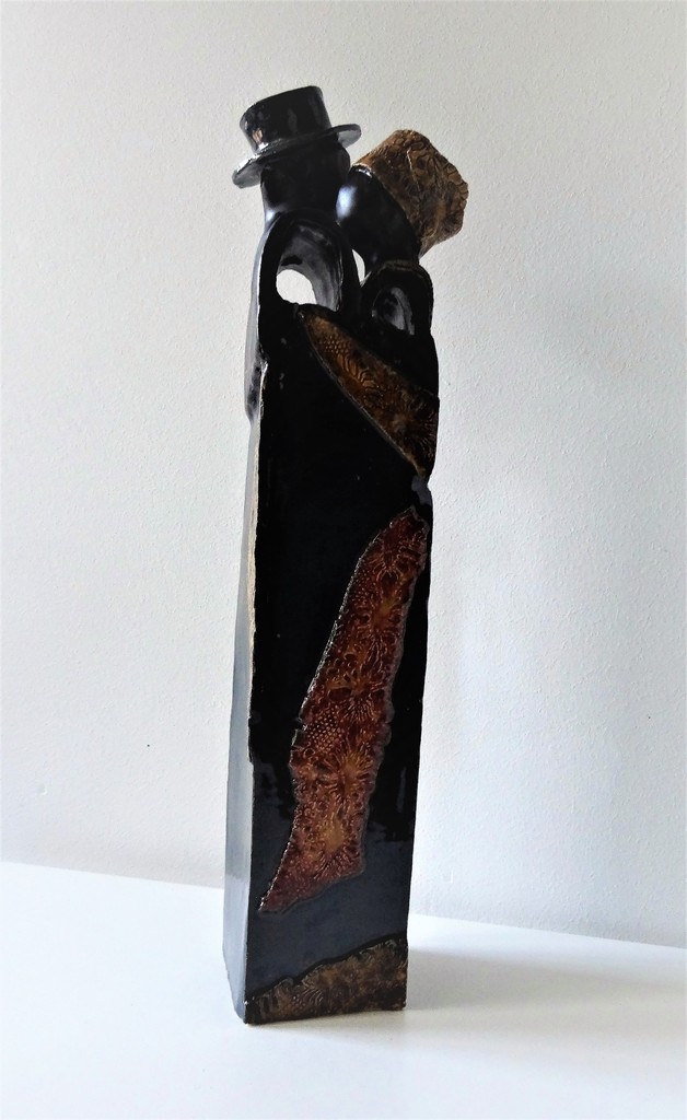 Liefde, man en vrouw innig bij elkar. Samen; vrouw met shawl, man met hoed.Bewerkt met kant in amber en bruine kleur. Onderkant glans zwart, lichamen en gezichten mat zwart. Indien gekocht in combinatie met Puber en/of Kind (1, 2), geldt een reductie op de prijs.