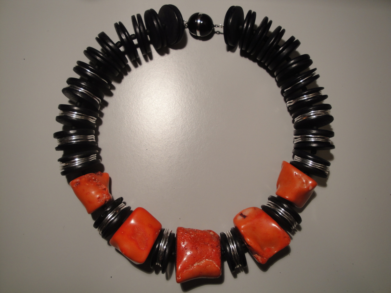 koraalbrokken, cocos- en zilverkleurige schijfjes; magneetslot; lengte 46 cm (verkocht)
