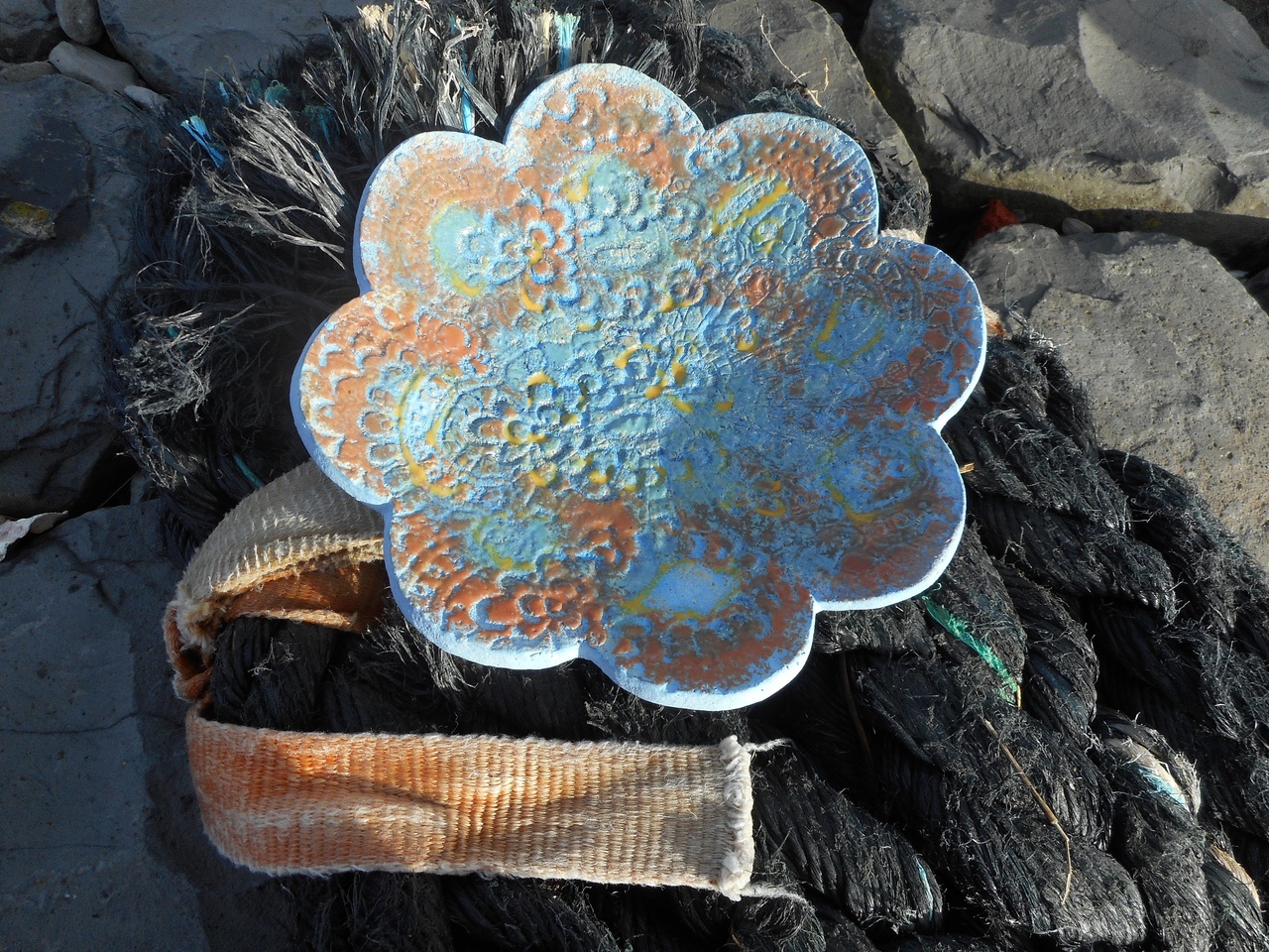 Schaal met schulprand...handvorm, bewerkt met engobes en glazuur.