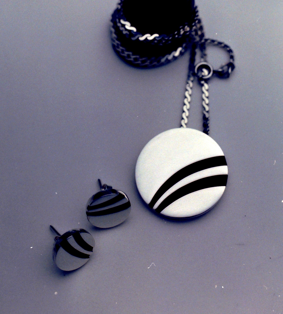 Hanger en ketting (reeds verkocht). Zilver deels zwart gepatineerd. 3mm dik. 25mm diameter (eventueel met bijpassend paar oorbellen, nog beschikbaar: zie Oorbel 13)