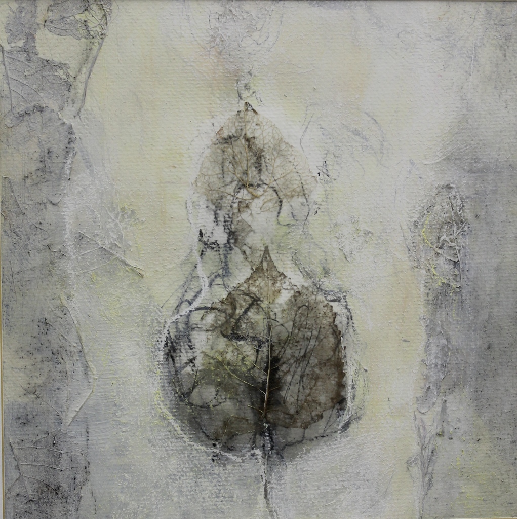halfvergaan eikeblad op papier achter glas, ingelijst. formaat 29 x 29 cm
