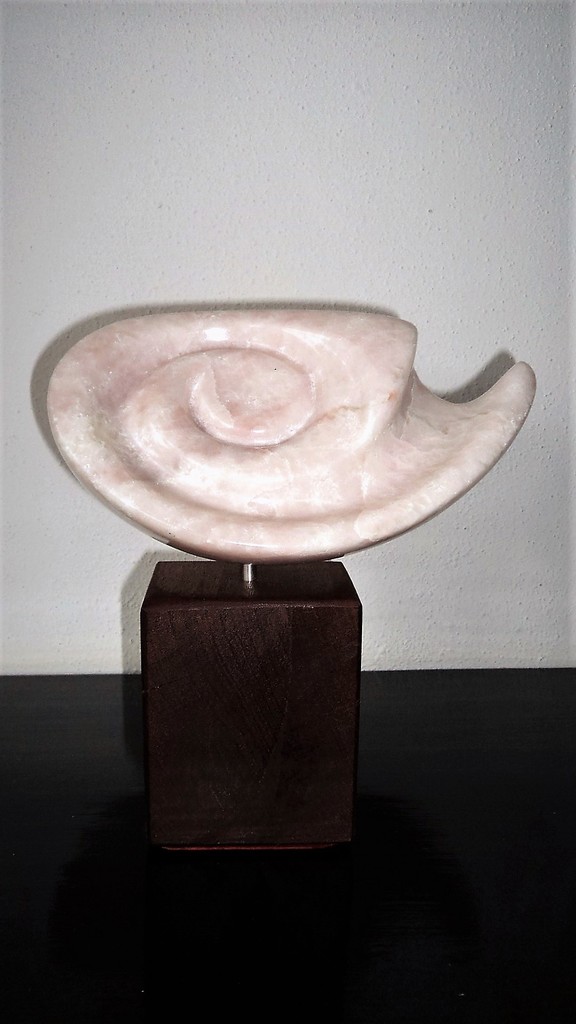 Mijn eerste beeld! Het is gemaakt van roze speksteen en staat op een houten sokkel. verkocht.