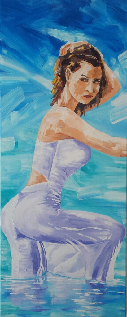 Een vrouwelijk model gekleed in een drijfnatte witte jurk.