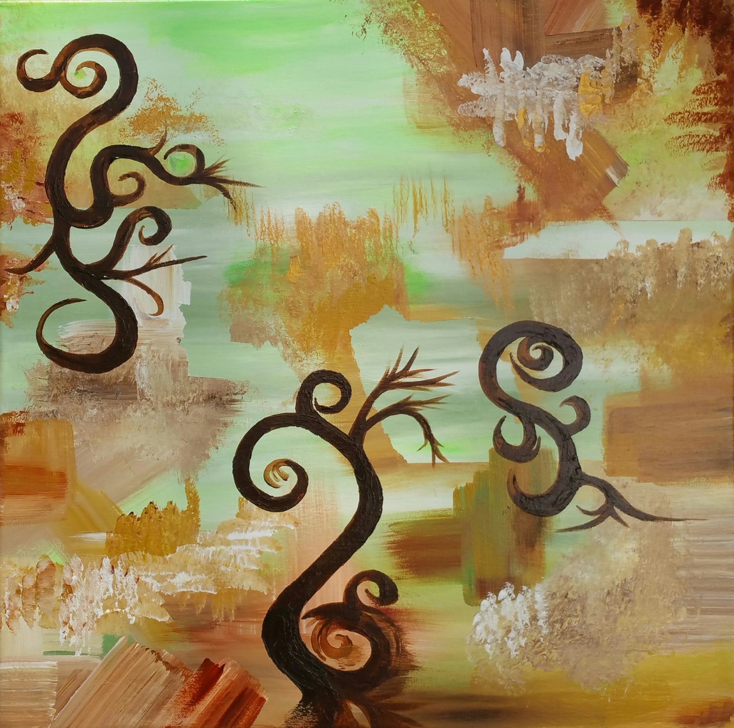 Organische vormen in overwegend groen en bruin-achtige tinten