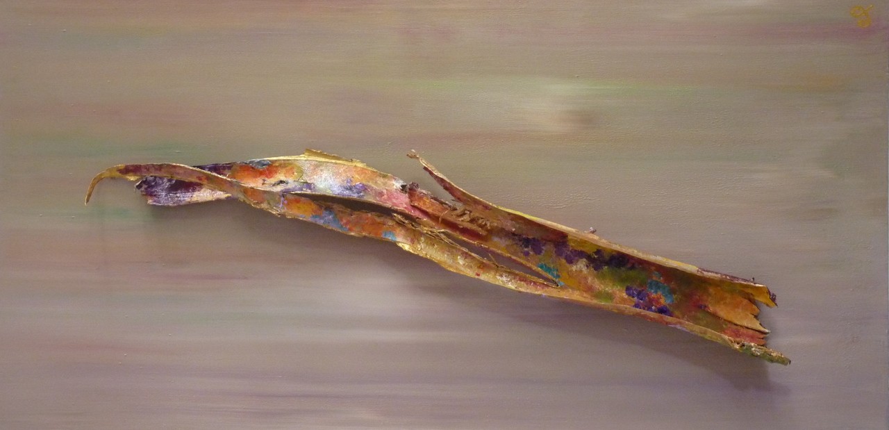 Bast verrast: een gedroogde bast van een beukenboom is beschilderd met acrylverf. De kleuren komen terug in de achtergrond. Het werk kan horizontaal en verticaal worden opgehangen.