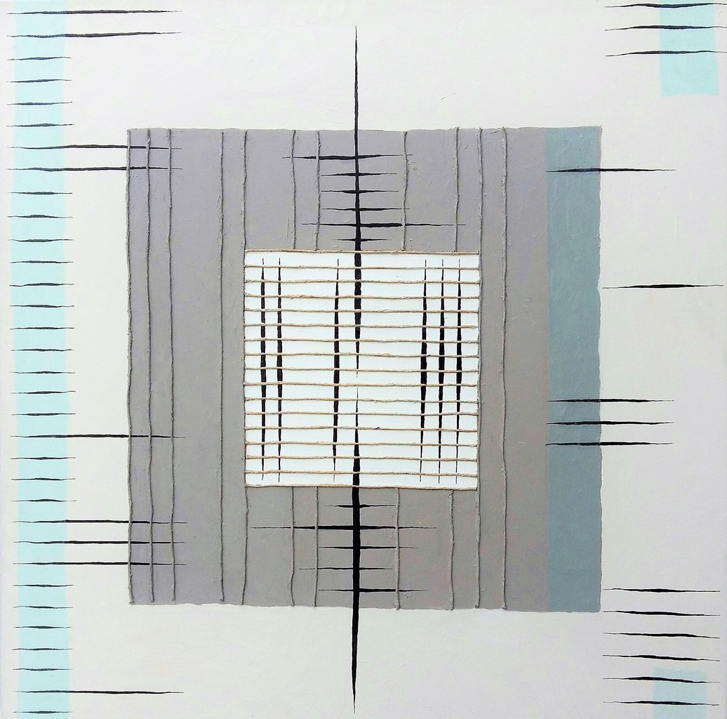 Een collage die door de vormgeving enigzins Japans aandoet. Er is gebruik van diverse materialen, waardoor relief en structuur ontstaat. De olieverf is, met spatel grof opgebracht.
