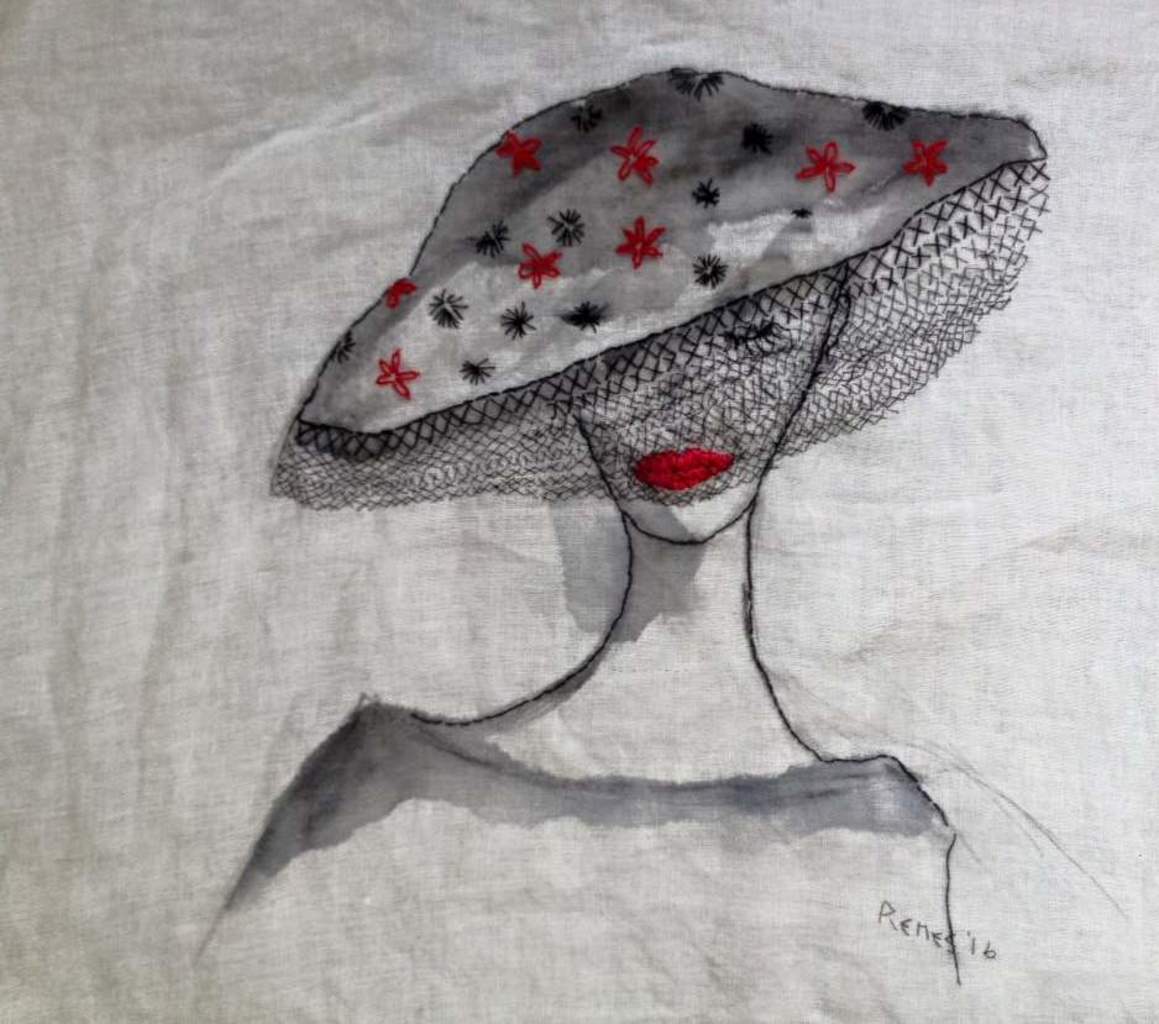 Borduurwerk, linnen op linnen met aqarelverf van een mysterieuze dame met een voile.