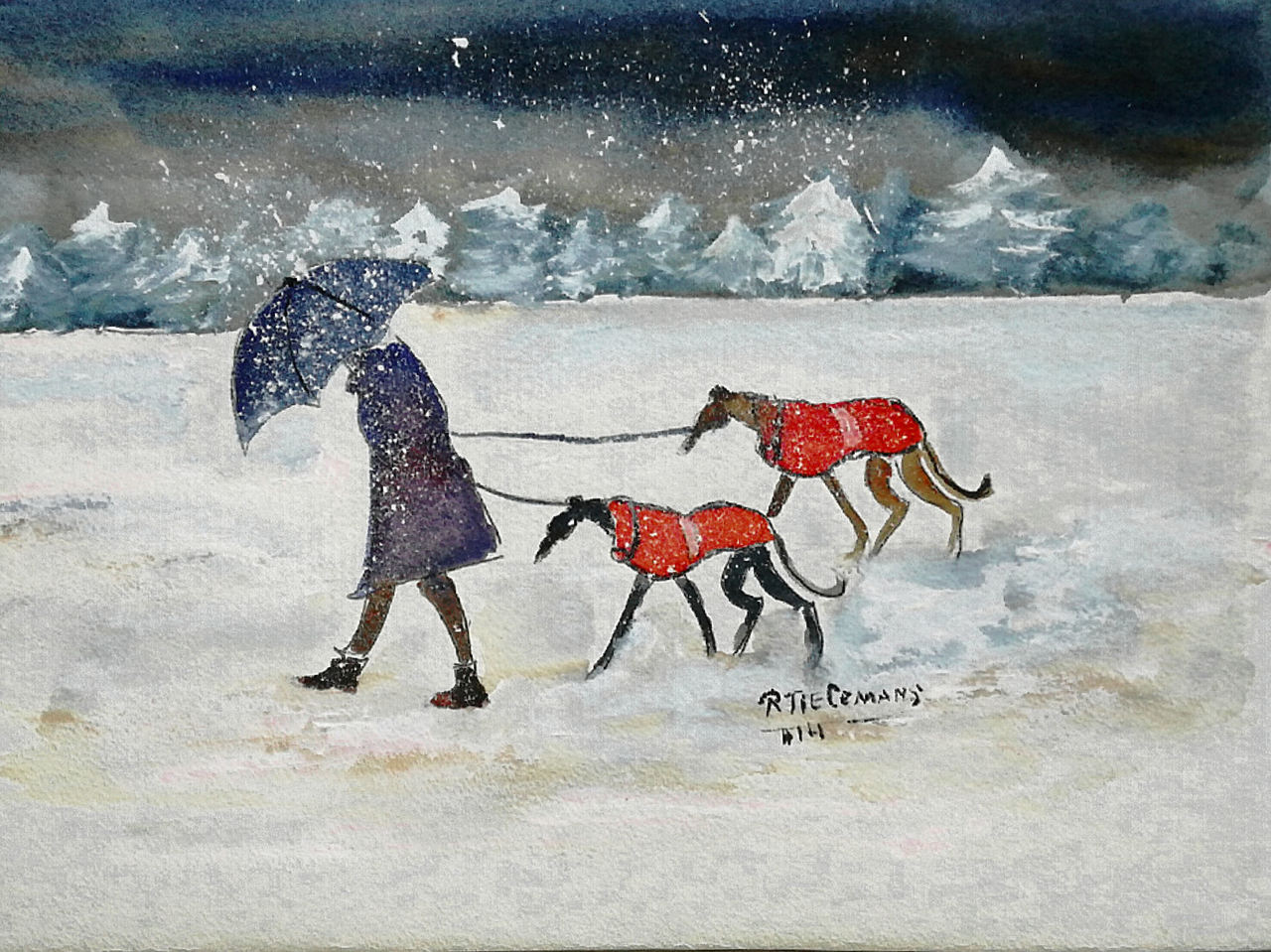 Rood Zwart Aquarel Sneeuw Red Winter Hond Black Dog Watercolour Snow