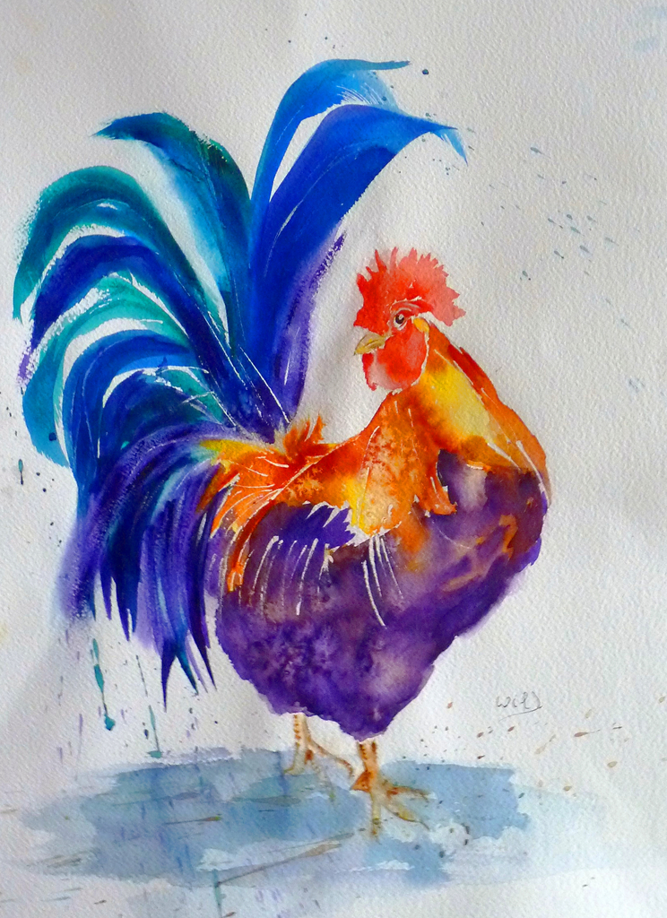 Geel Blauw Groen Aquarel Kip Haan