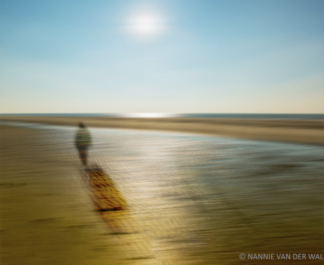 Een figuratief werk van een persoon op een strand met een olieverfschilderij effect. De op dit werk gebaseerde foto heb ik Bergen aan Zee gemaakt.