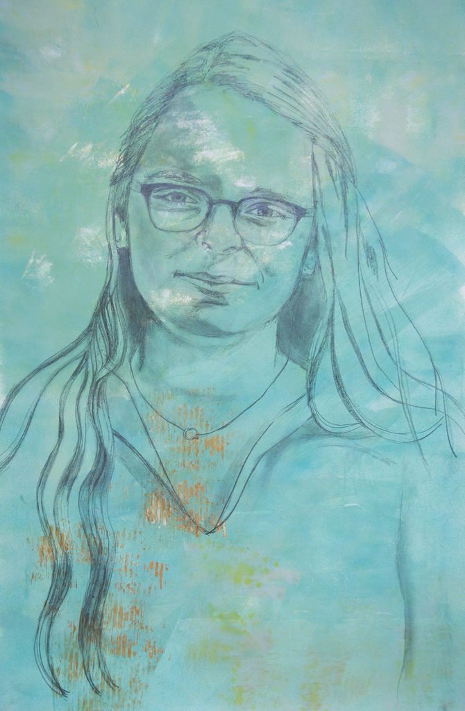 Van Roos en haar zus Suzan heb ik portretten in opdracht gemaakt. Achtergrond is acryl waarop getekend is met potlood.