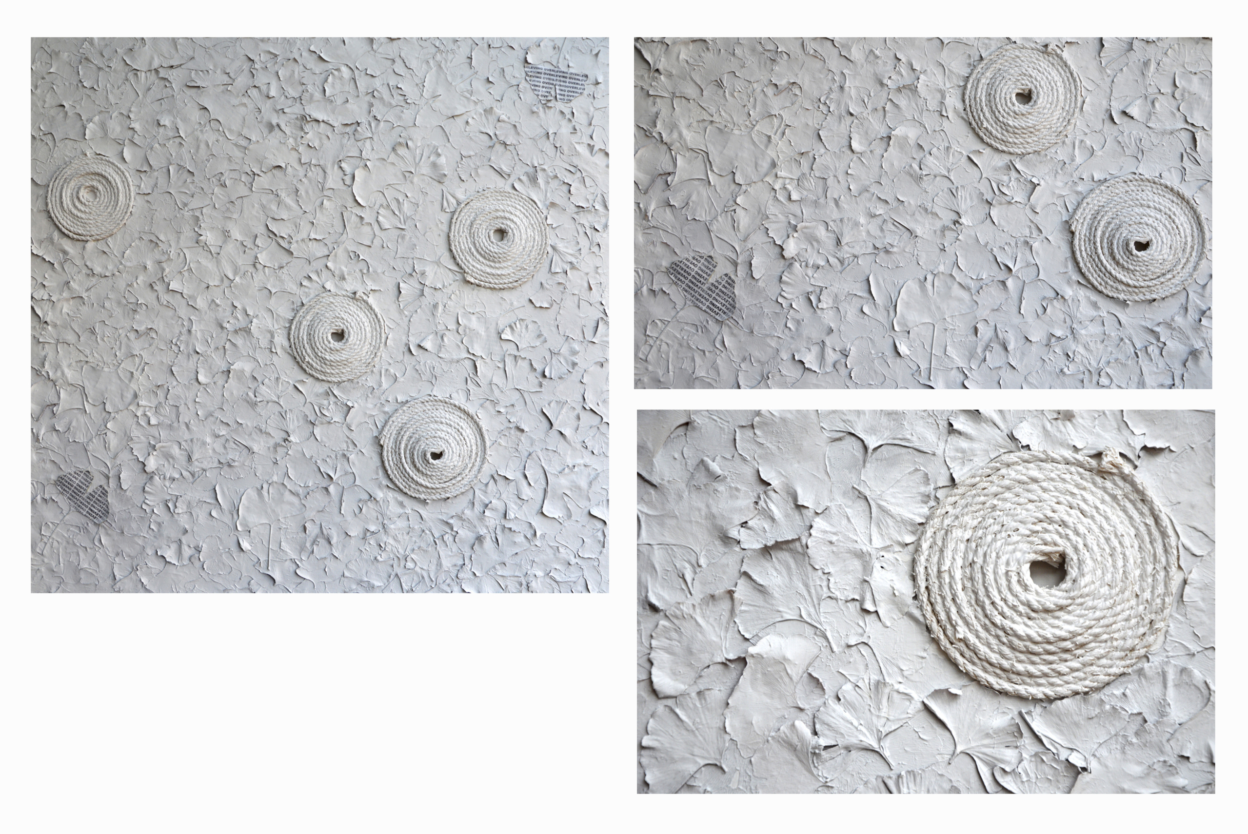 Linnen, opgespannen op aluminium spielatten. Bladeren van de Ginkgo Biloba (Japanse Notenboom. Toen in 1945 de atoombom op Hiroshima gedropt werden stonden tal van Ginkgo’s in de onmiddelijke nabijheid van het epicentrum, de verwondering was dan ook groot toen bleek dat deze bomen, reeds na enkele weken opnieuw bladeren begonnen te maken en geen enkele afwijking vertoonden, tot op vandaag leven ze nog steeds !