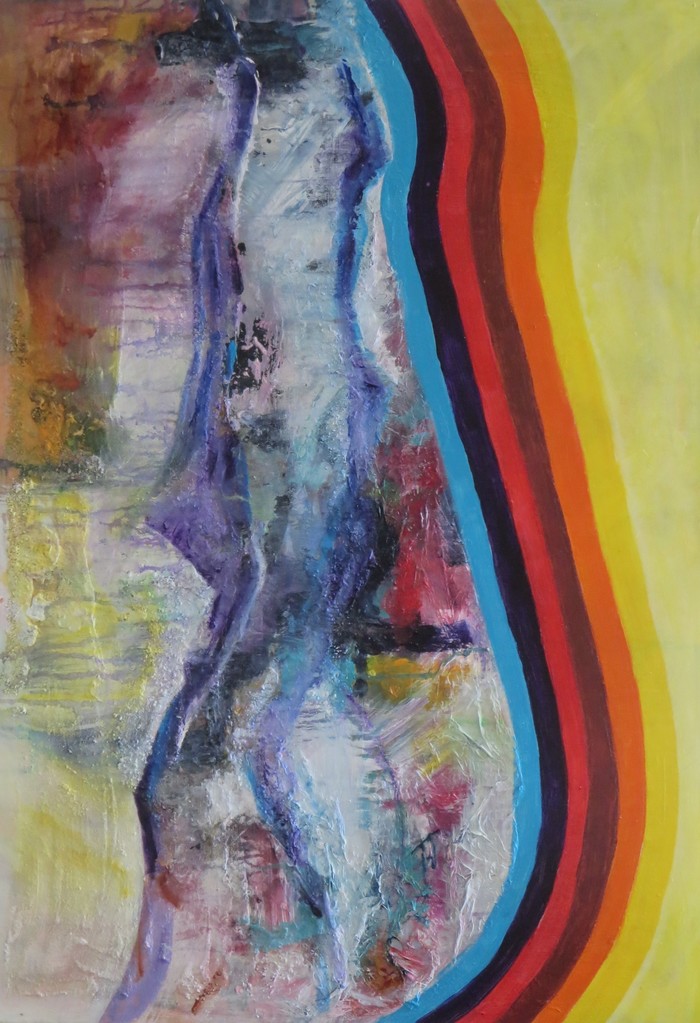 Acrylverf op doek met verschillende materialen.