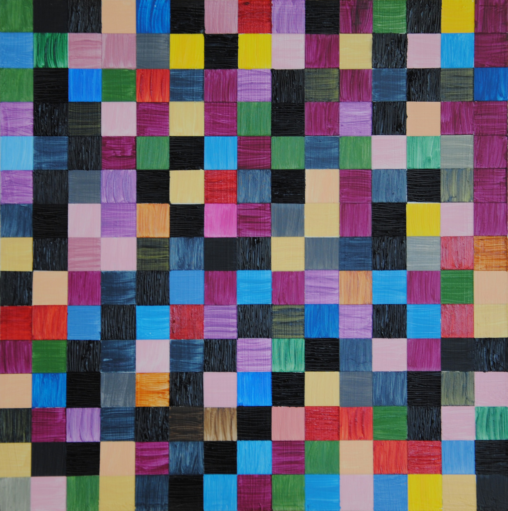 Thema: Chaos (Geometrische Chaos) Mijn kunst is beïnvloedt door de moderne wiskundige en wetenschappelijke benadering van het begrip complexe orde van de natuur. Met name heb ik me verdiept in de Chaos theorie en de fractal geometrie. Ik ben geen wiskundige, en ik gebruik geen wiskundige formules. De ideeën van de Chaos theorie en fractal geometrie leiden tot de ontwikkeling van de composities in mijn werk. Ik gebruik driehoeken,vierkanten en cirkels in mijn schilderijen, maar in mijn huidige serie, geoChao richt ik me alleen op de vierkanten en de verhoudingen tussen de vierkanten. Ik ontwikkel mijn composities door kleine vierkantjes op grote te zetten of grote op kleine te zetten. Het gaat om de onderlinge verhoudingen tussen de vierkanten. Ik laat de methode die ik kies de compositi