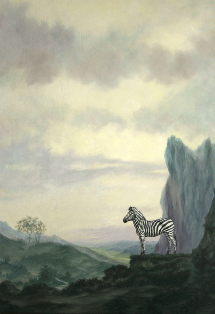 Een fantasielandschap met een zebra op de uitkijk.