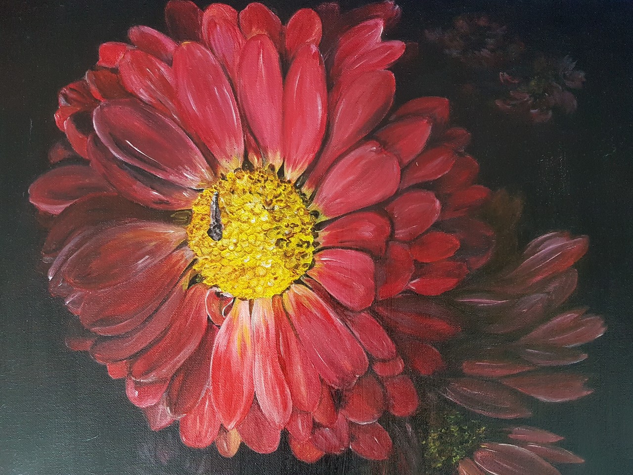 Rode zommerbloemen op zwart achtergrond. Ik heb mij nooit verdiept hoe deze bloem precies heet. Ze groeien in onze achtertuin bij onze zomerhuis. Ik heb ze met mijn eerste digitale camera gefotografeerd en daarna geschilderd.