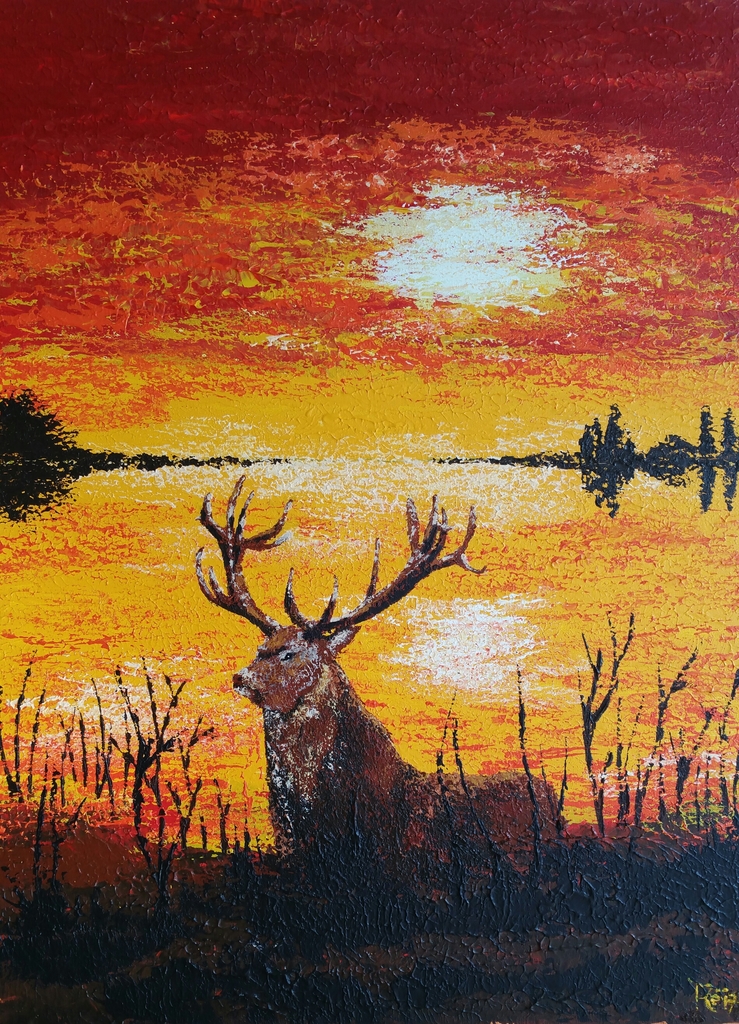 Edelhert rust aan een oever tijdens een zonsondergang, werk volledig op doek opgezet met een paletmes