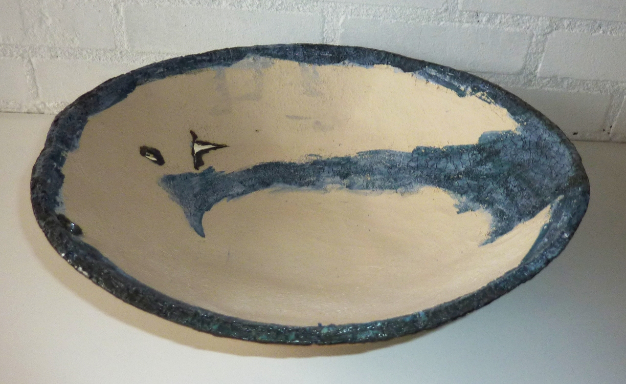 Grote schaal Ø33cm nr.254 bewerkt met kobalt oxide. Gemaakt met grove chamotte klei.