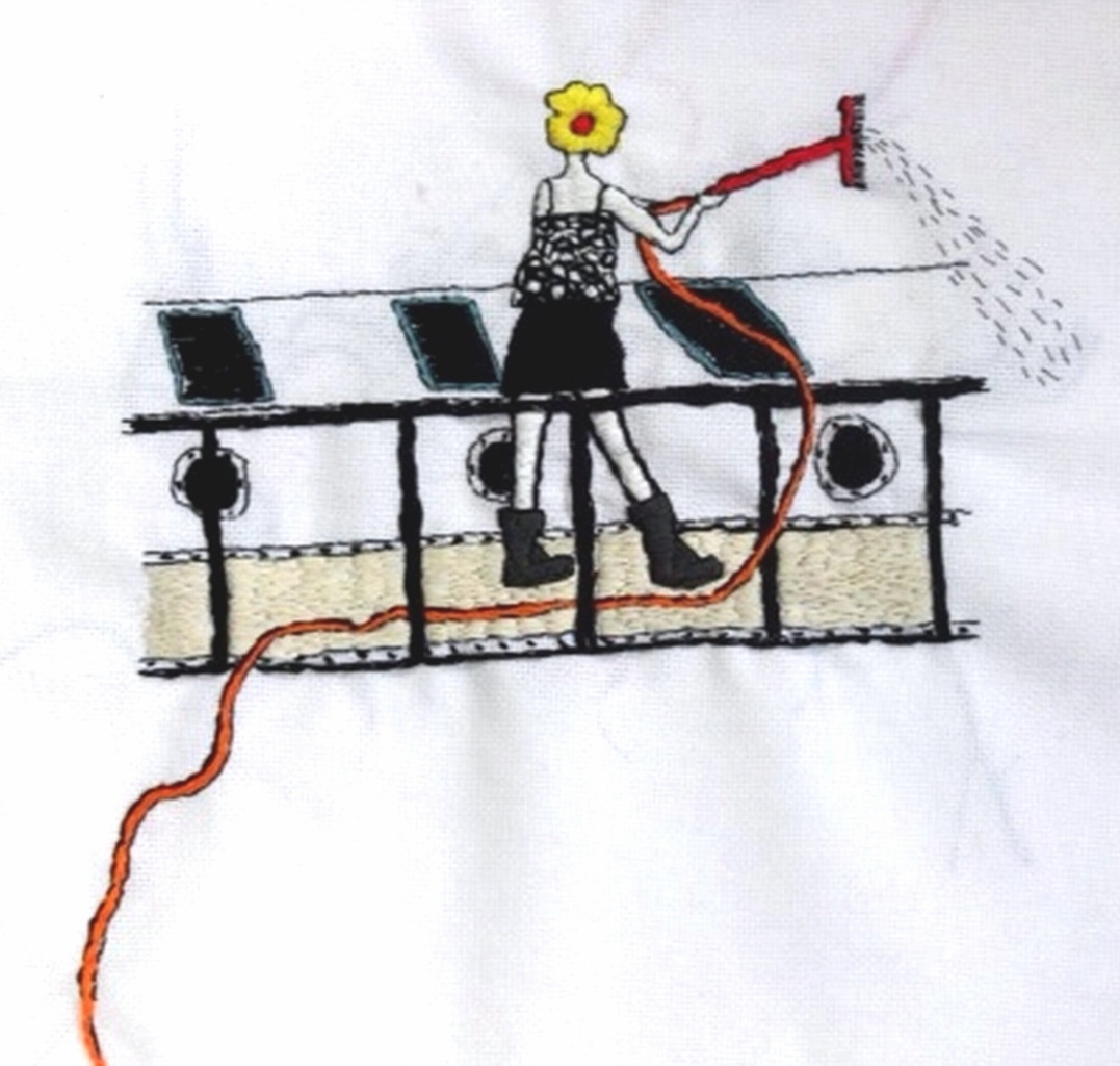borduurwerk van het spoelen van onze woonboot geinspireerd op een tekening uit mijn dagboek