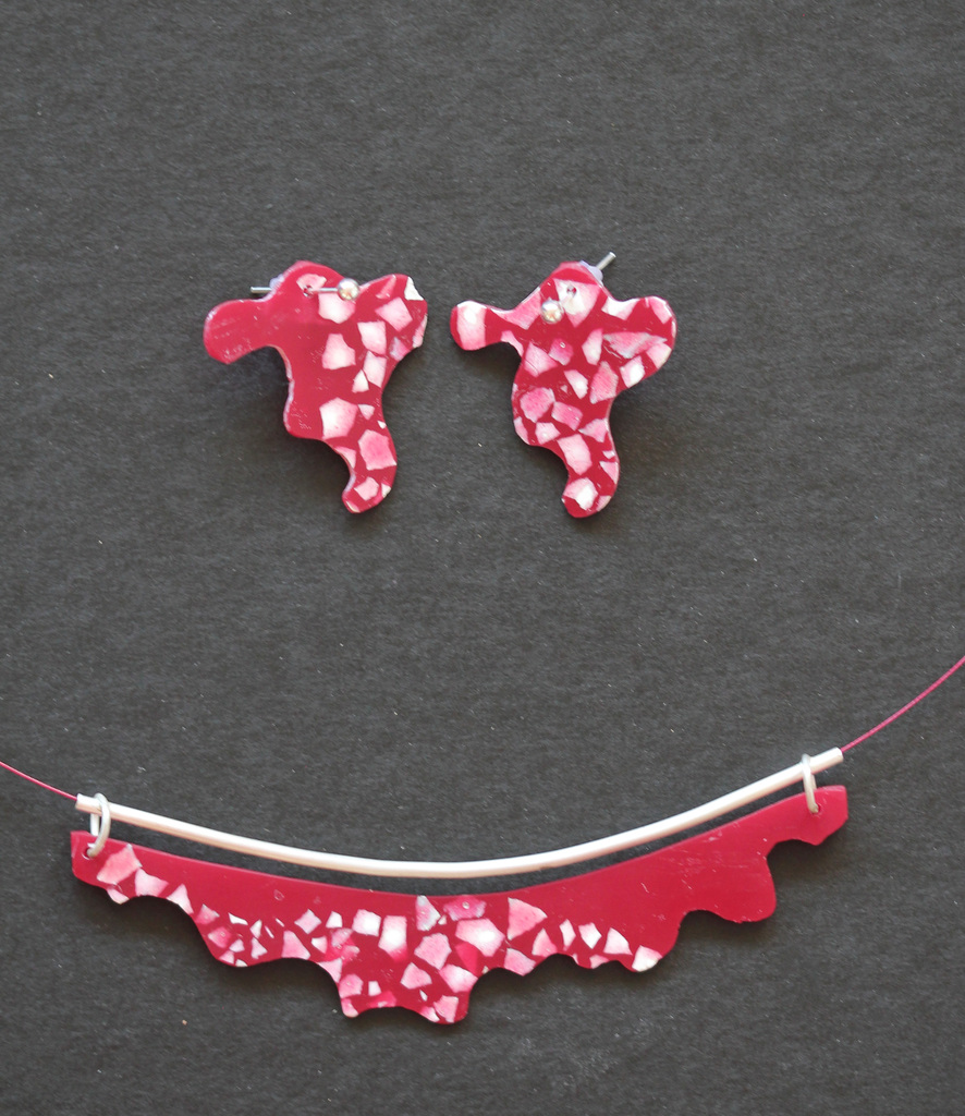 Rode kunsthars met eierschaal. Inclusief Oorbellen