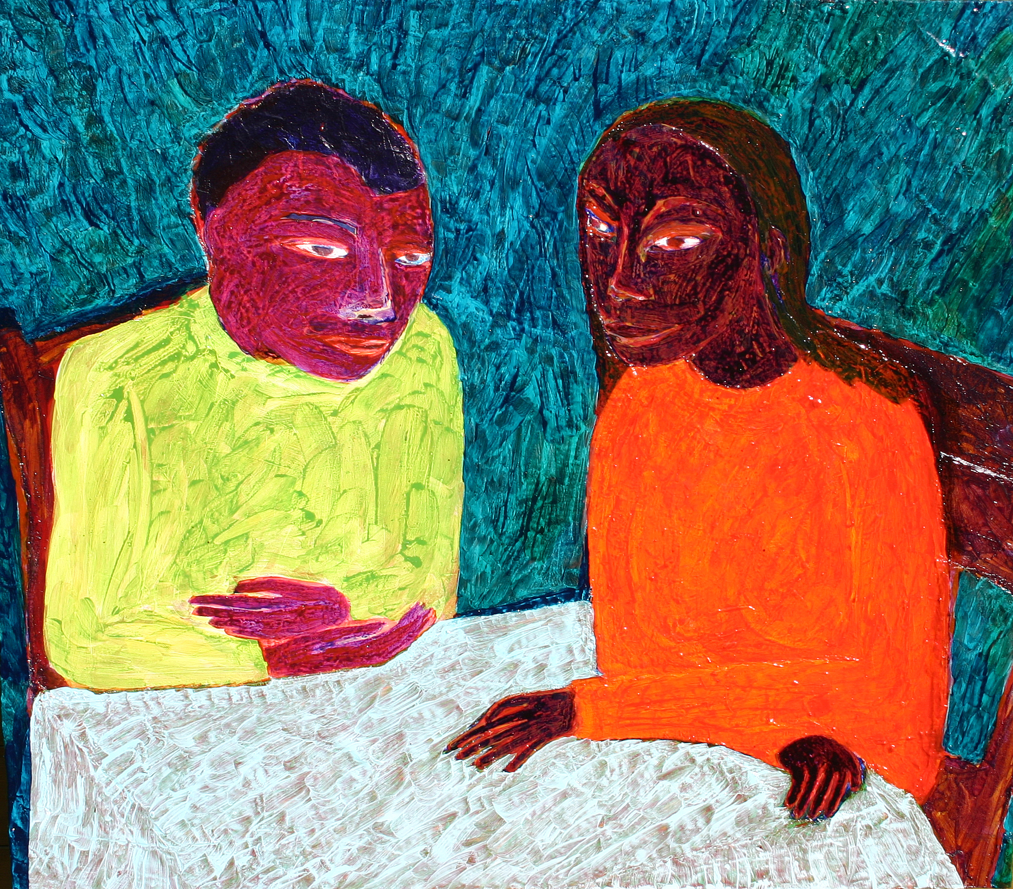 diepgaande uitwisseling tussen twee elkaar liefhebbende maar daardoor nog niet vanzelf begrijpende mensen. (1992-2006, acryl, papier, stof, vinyl op hout)