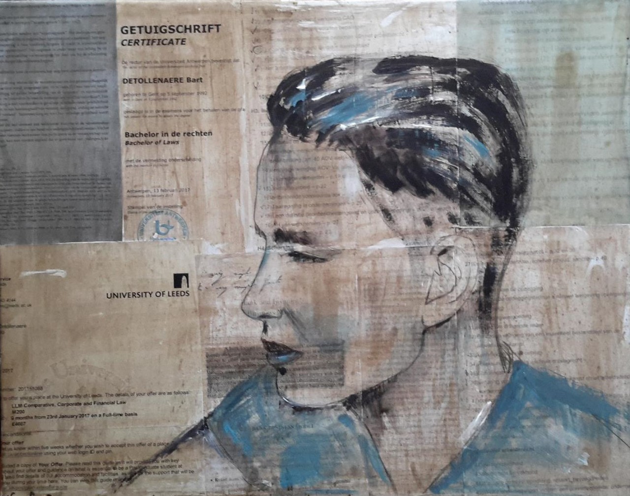 Mijn zoon Bart. Hij studeert Rechten, heeft al een bachelor behaald en doet zijn manama in Leeds. De achtergrond van dit werk symboliseert dit alles met de teksten uit de wetboeken, brieven van de universiteit enz...