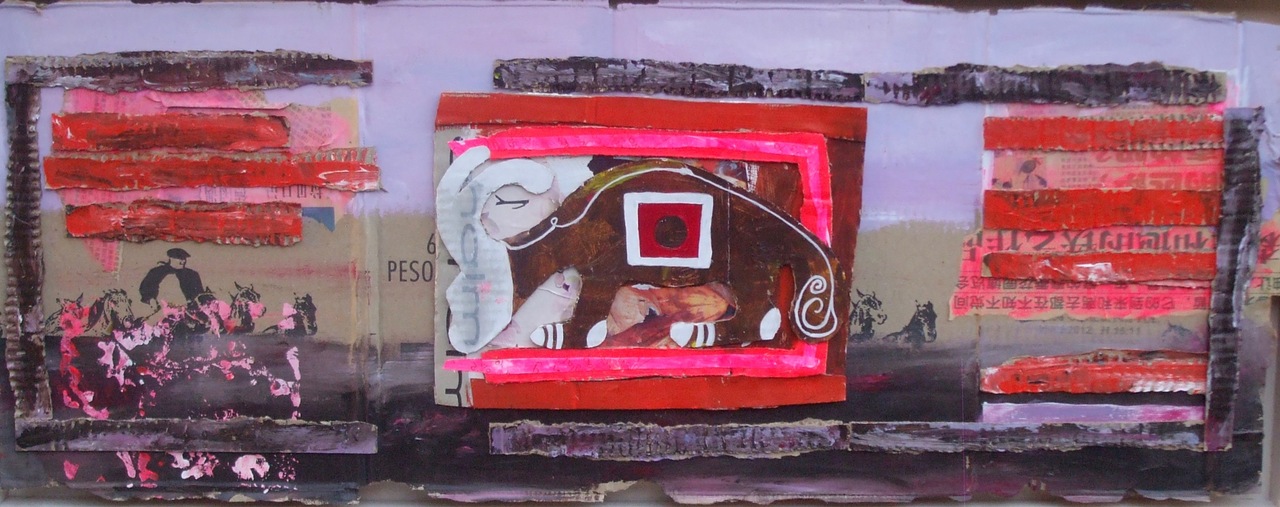 Bok zonder kop, acrylverf / collagetechniek op gerecyceld karton, in houten baklijst