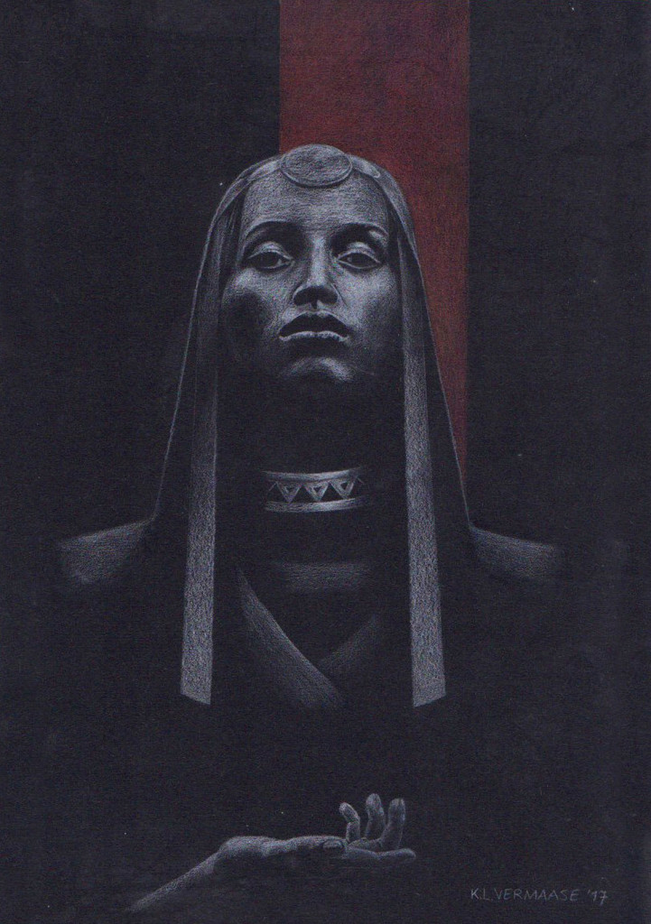 Vrouw Portret Tekening Donker Duister Orakel Zwartwit Kleurpotlood Contrast Symbolisme Oudheid Esoterie Delphi Pythia