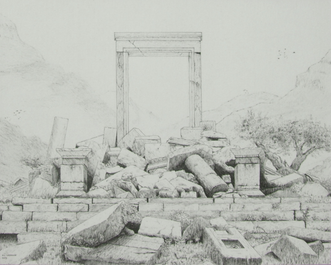 Landschap Papier Steen Tekening Grieks Zuil Inkt Pen Architectuur Tempel Ruïne Poort Vergankelijkheid Symbolisme Oudheid Turkije Mediterraan Vallei Steinbach