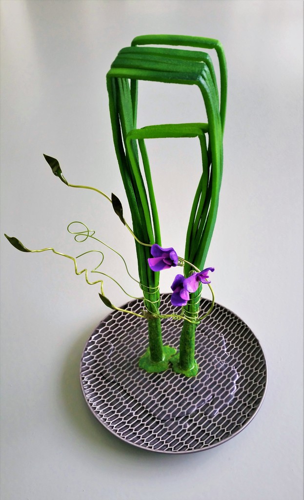 Ikebana met Lathyrus, foam, pvc klei, mixed media