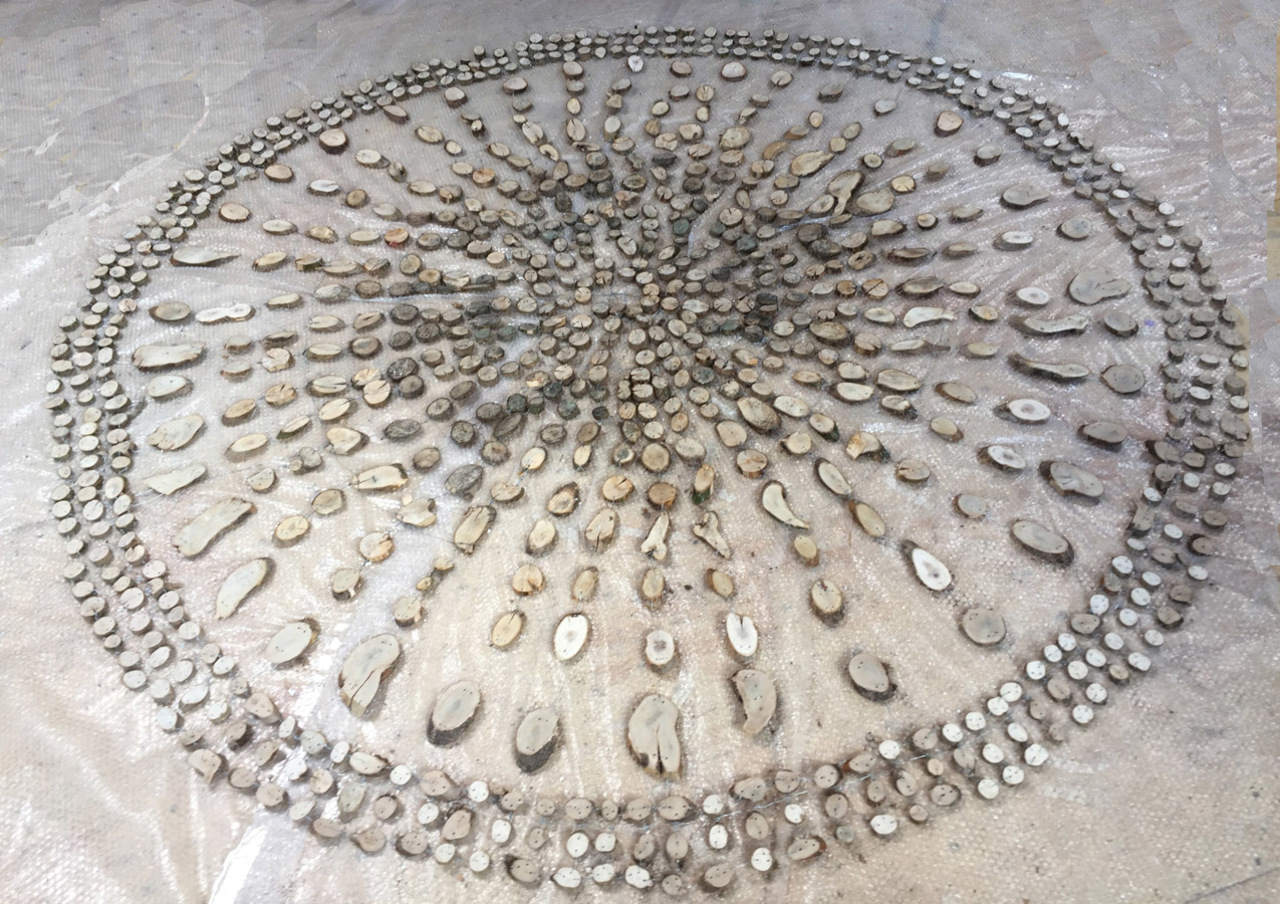 Platte gezaagde schijfjes van takken vormen een cirkel vol beweging.
